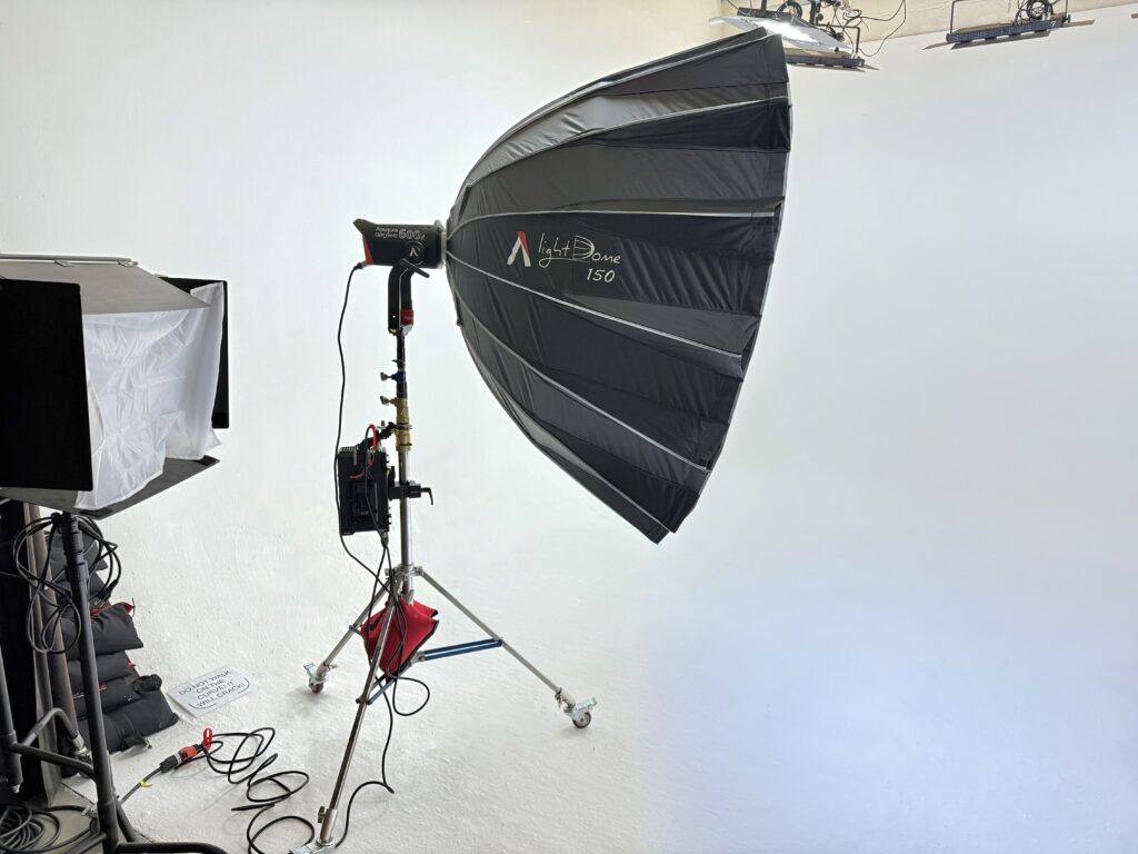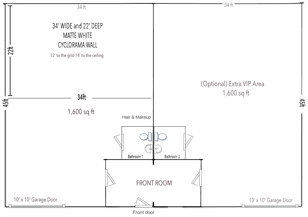 We offer between 3,200 square feet (1,600 square feet of shooting studio space plus an optional 1,600 square feet of VIP green room / additional shooting space), which you can see here. The studio includes a White CYC (Cyclorama/Infinity) wall, 34′ wide and 22′ deep, flat matt, part of which can be converted into a green-screen with green-screen cloth. We offer equipment and many amenities to make your experience second to none. Our space is perfect for your video / film or photo shoot.